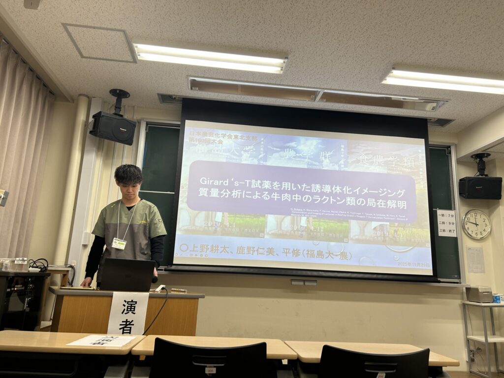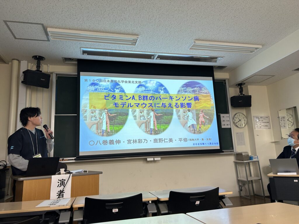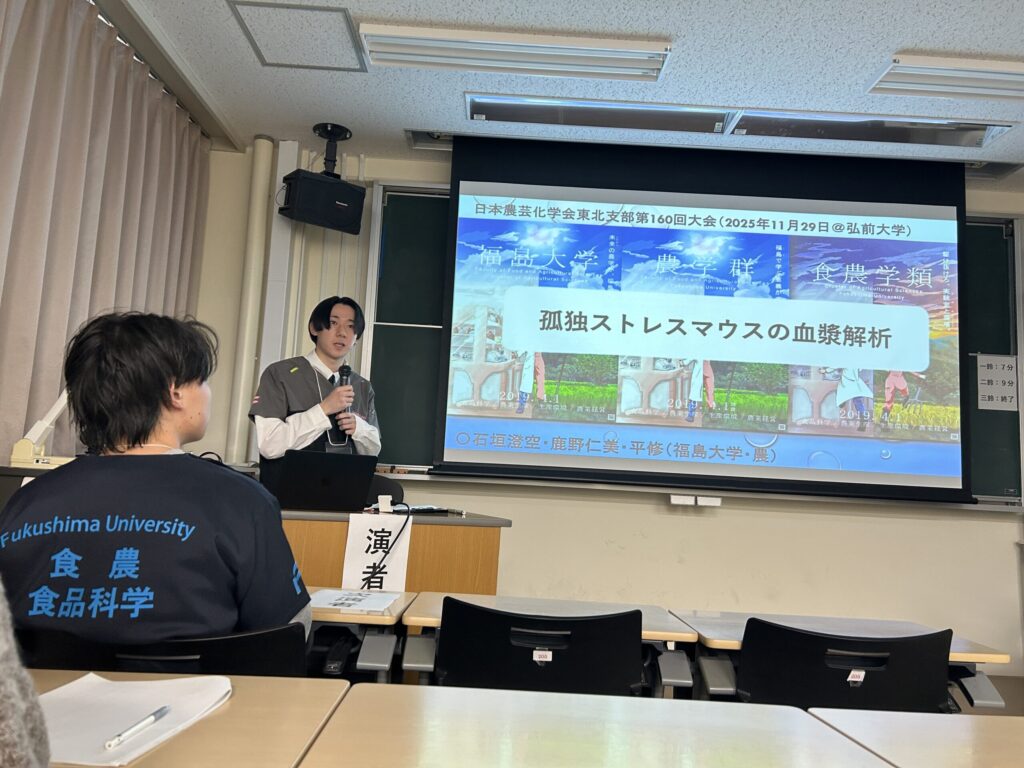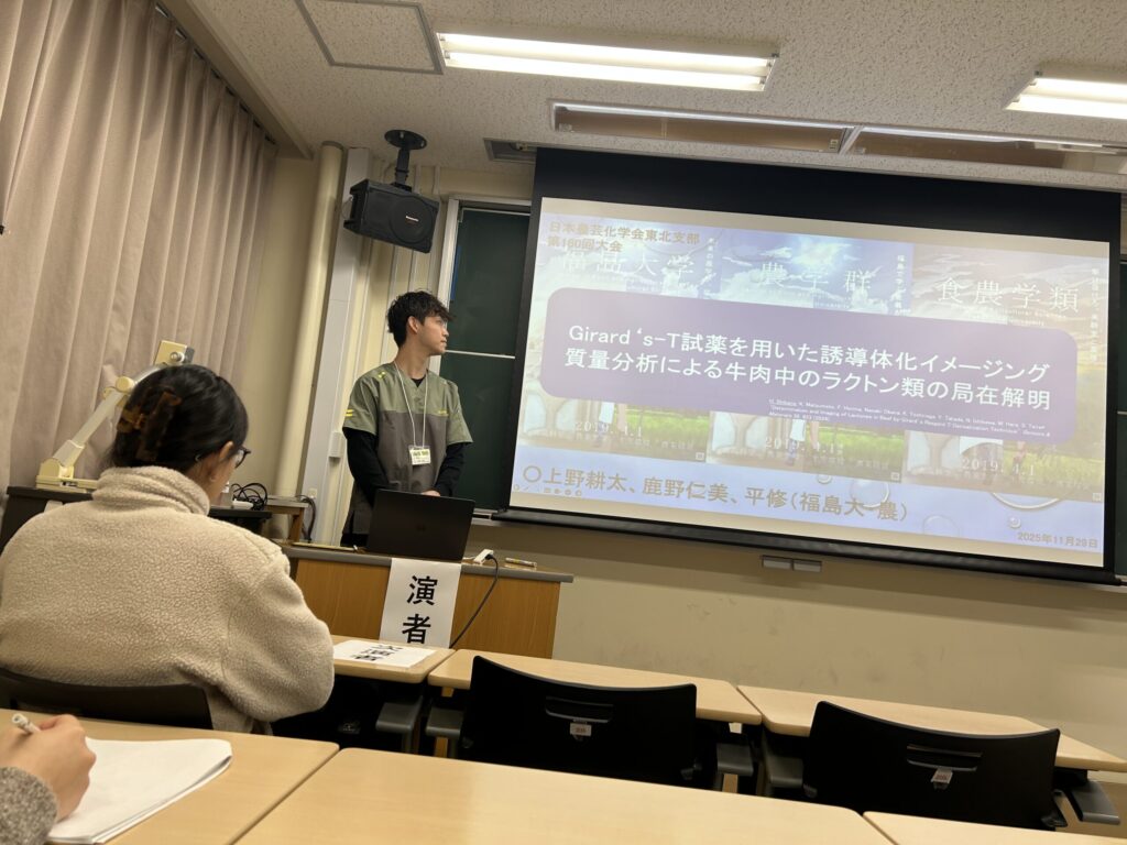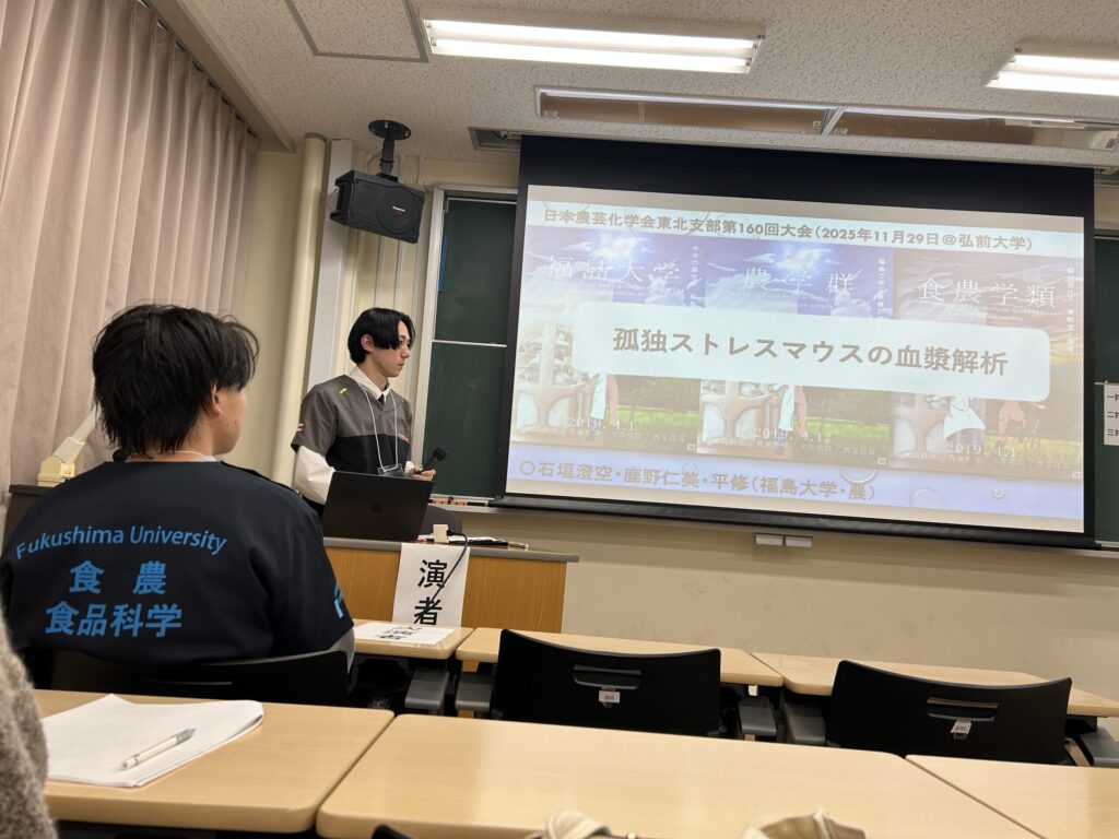 2025.12.01 日本農芸化学会東北支部第160回大会で発表してきました 2025年11月28-29日に弘前大学(青森県)で日本農芸化学会東北支部第160回大会が開催され、本学学生が、前日開催の若手の会から参加・発表をしてきました。若手会では寝る間もおしんでポスター発表に興じ、翌日は口頭発表をする。というハードな日程でした。