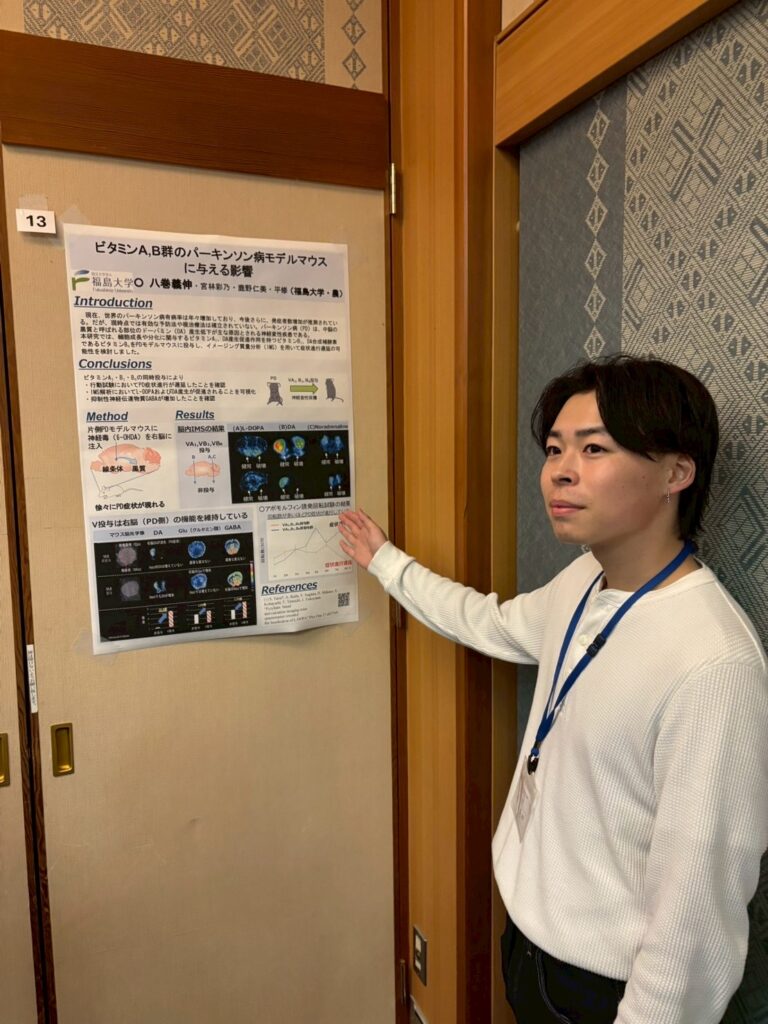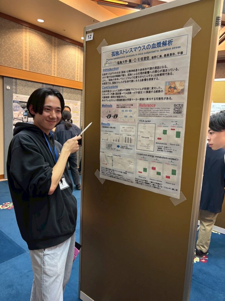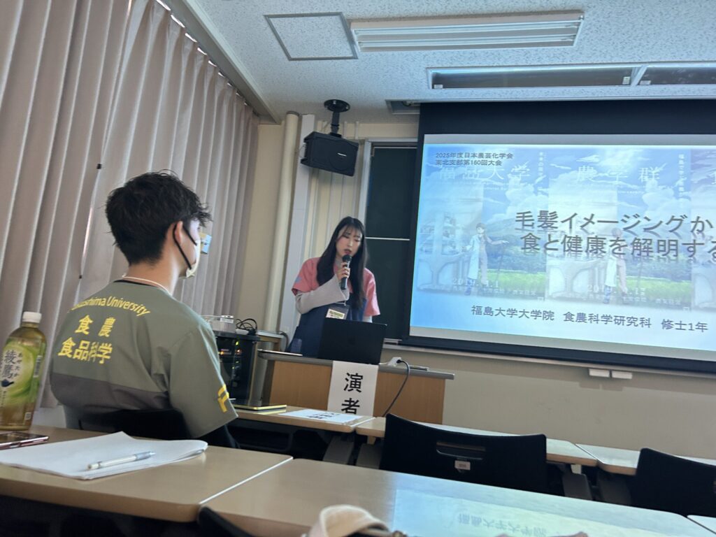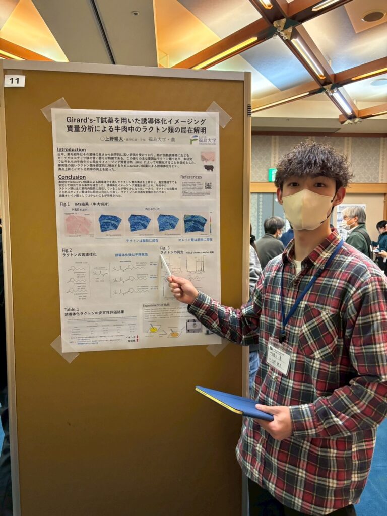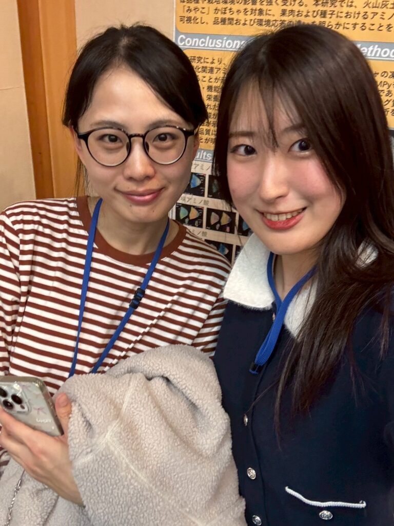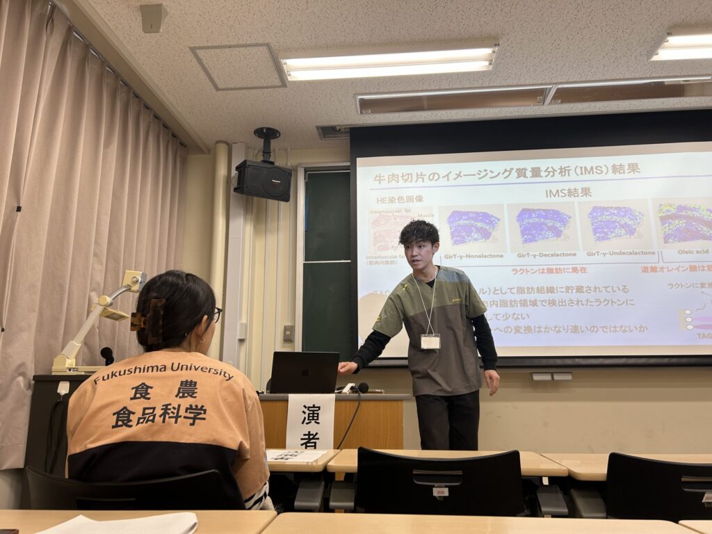 2025.12.01 日本農芸化学会東北支部第160回大会で発表してきました 2025年11月28-29日に弘前大学(青森県)で日本農芸化学会東北支部第160回大会が開催され、本学学生が、前日開催の若手の会から参加・発表をしてきました。若手会では寝る間もおしんでポスター発表に興じ、翌日は口頭発表をする。というハードな日程でした。